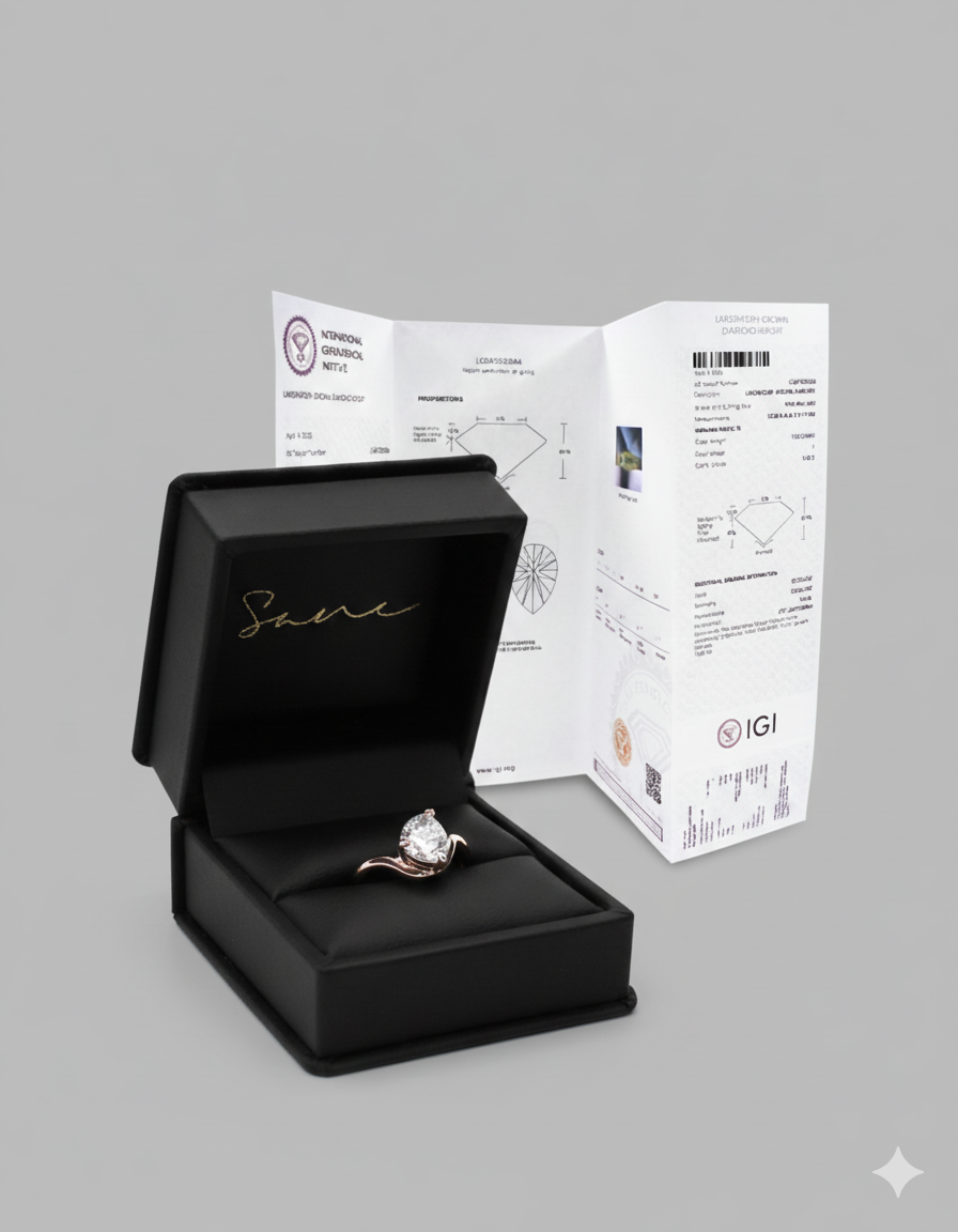 Te entregamos tu anillo en un empaque especial, junto con un certificado de autenticidad de tu diamante.